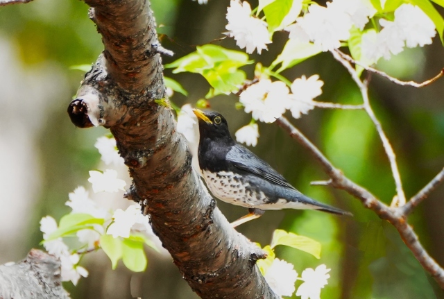 久々のクロツグミ♂、地面から飛び去り遠くの木立にとまった。
