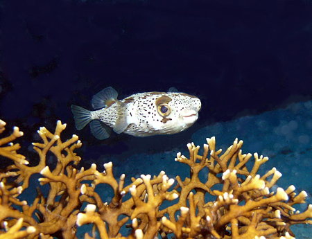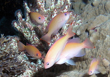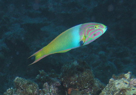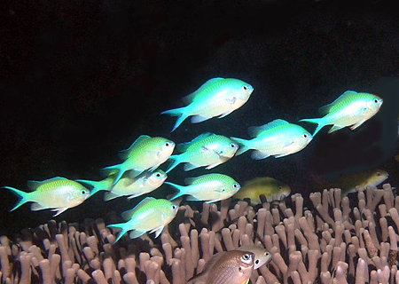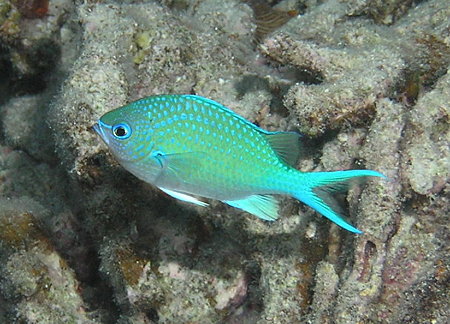 アオバスズメダイ デバスズメダイに似ているが鰓蓋に黒点がある。 |