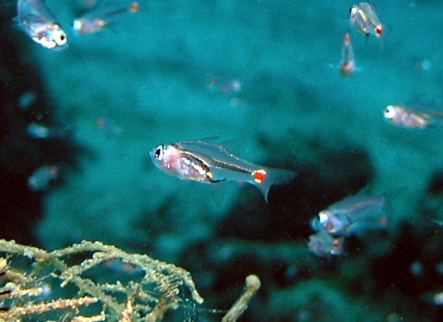 体は透明感があり吻から尾柄部にかけ、体側中央に1黒色縦帯。尾柄後端に明瞭な1赤色斑が本種の特徴。