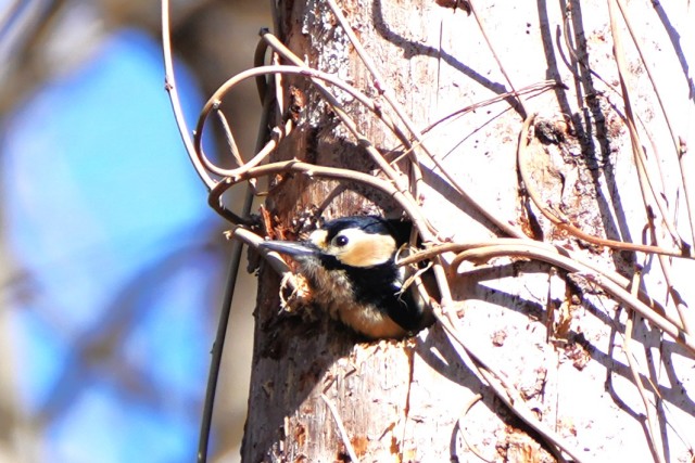 | 高くて遠いアカゲラさんに翻弄されカメラを支える腕と見上げる首が痛くなって しまった。 巣穴に入っている様子には癒される。 |