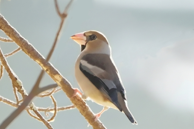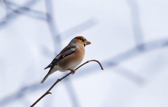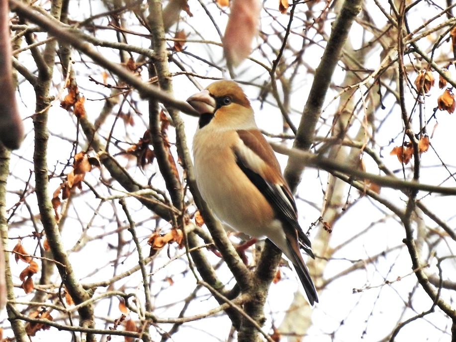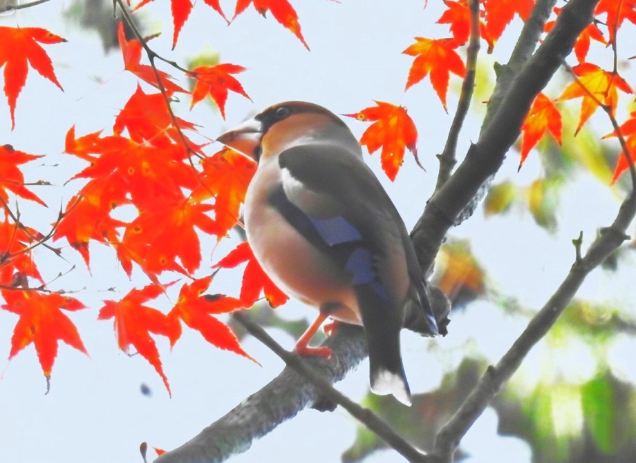 | 蝋梅の咲く径から見上げる坂の上の高木に。目の周りが黒くないので♀ | |