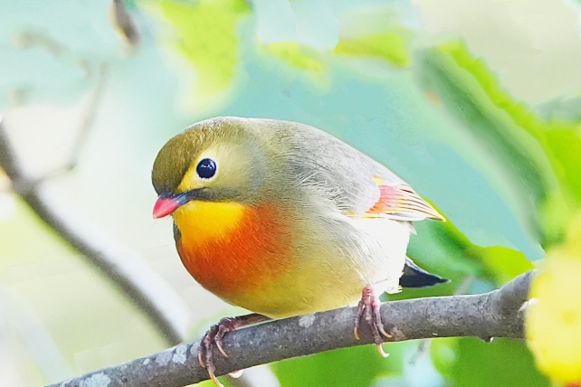 | 初見のソウシチョウ。 こんなカラフルな野鳥が身近に居ようとは、近くにこなければ まず気が付かない。 |